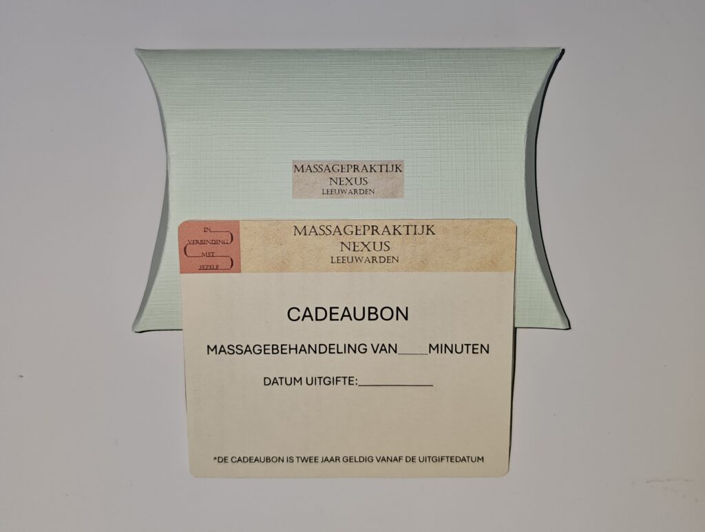 In verband met de geplande massages is het voor het ophalen van de cadeaubon verplicht om via de mail (info@massagepraktijknexus.nl) af te stemmen wanneer de cadeaubon opgehaald kan worden.